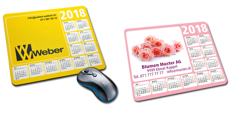 Profitieren Sie von Mengenrabatten. Die Mausmatte mit Kalender 2018 ist ein nützliches Geschenk für Ihre Kunden. Auch Kleinauflagen möglich. Auf Wunsch erarbeiten wir für Sie auch Gestaltungsvorschläge.